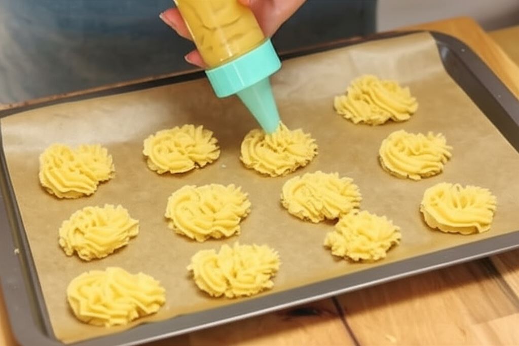 Blachę wyłóż papierem do pieczenia, ciasto umieść w rękawie cukierniczym z końcówką gwiazdkową i wyciskaj niewielkie ciasteczka o okrągłym kształcie.