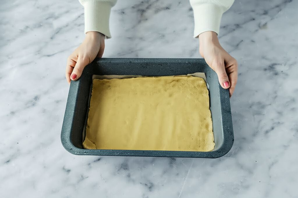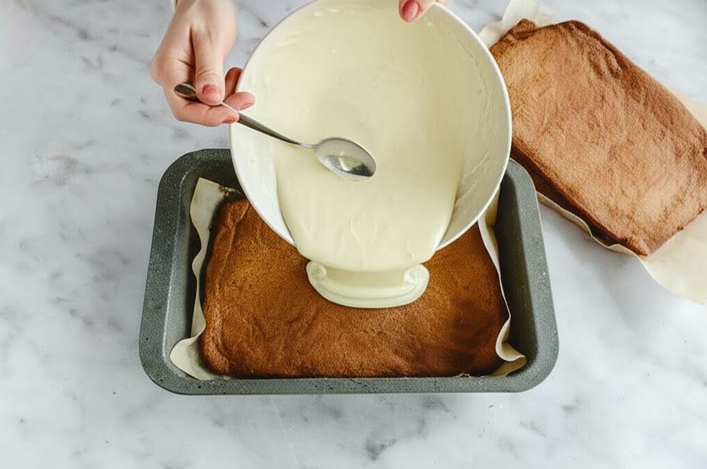 Na spodzie formy umieszczamy przestudzony blat. Pokrywamy go pierwszą porcją masy budyniowej. Potem kładziemy drugi blat i znów smarujemy resztą masy. Wierzch nakrywamy trzecim blatem.