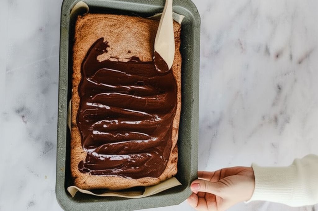Czekoladę topimy w kąpieli wodnej. Wrzucamy masło. Starannie mieszamy. Uzyskaną masą zalewamy ciasto. Odstawiamy do lodówki na min 30 min do zastygnięcia.