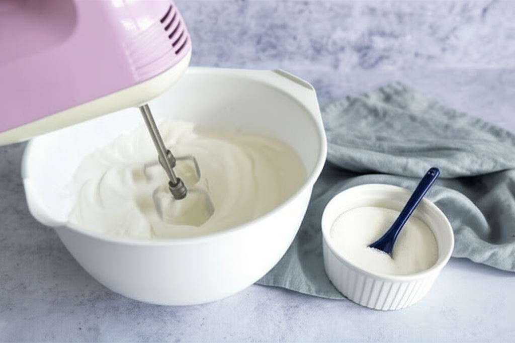 Ubij białka na sztywno. Stopniowo wsypuj cukier. Miksuj aż uzyskasz błyszczącą masę.