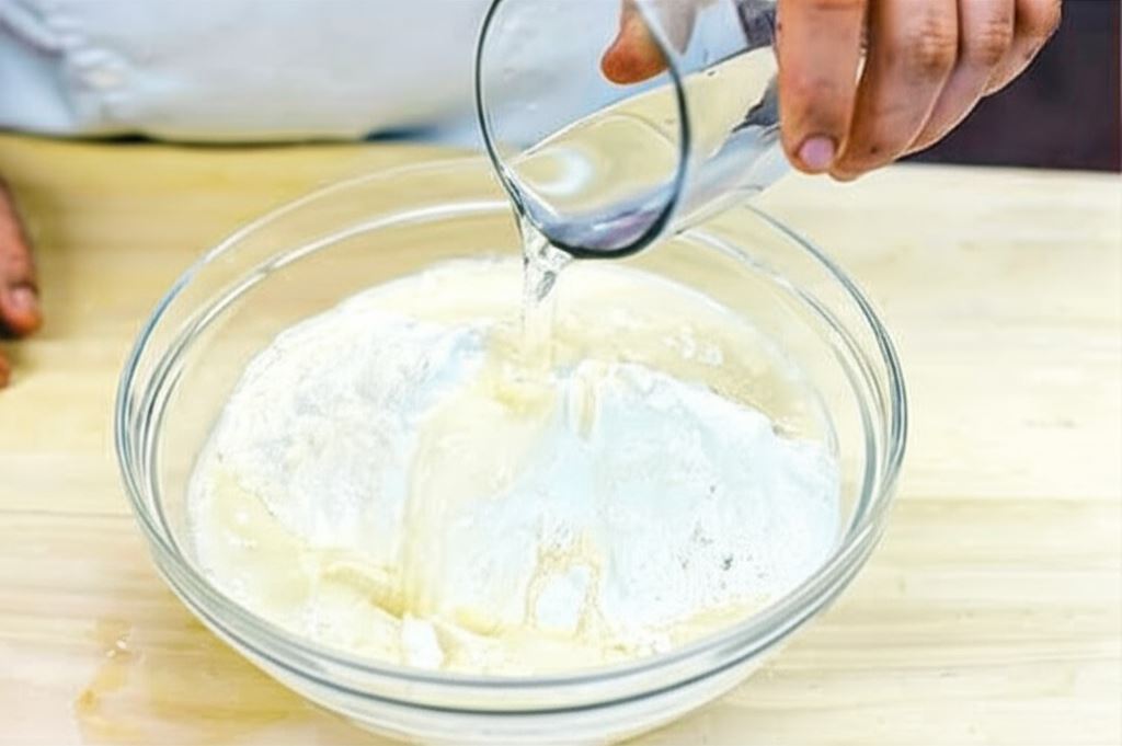 Wsyp sól i wodę – wymieszaj ciasto. Jeśli okaże się za rzadkie, dosyp trochę więcej mąki.