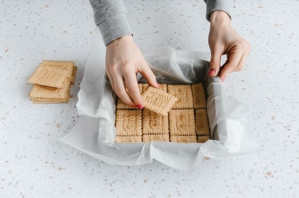 Formę wyścielamy papierem do pieczenia. Spód wykładamy herbatnikami.