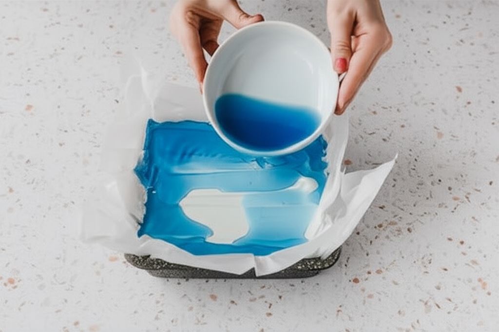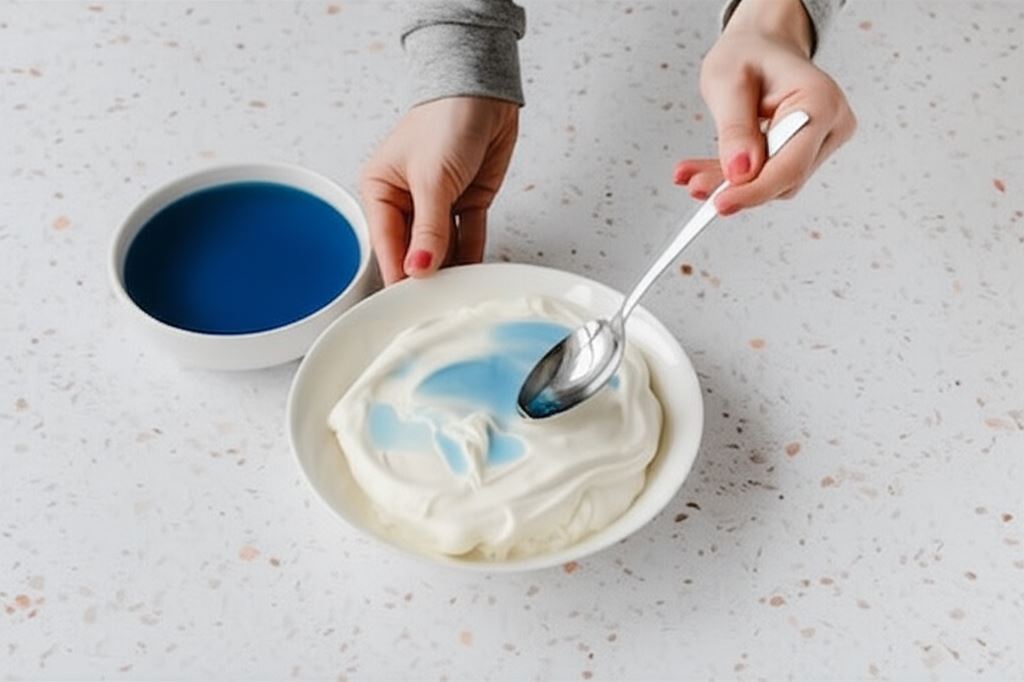 W tym czasie dwie niebieskie galaretki rozpuszczamy w wodzie i odstawiamy do ostygnięcia. Śmietanę ubijamy do sztywności. Po chwili dodajemy schłodzoną niebieską galaretkę