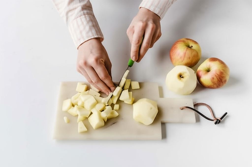 Jabłka płuczemy, zdejmujemy skórkę i siekamy w kostkę.