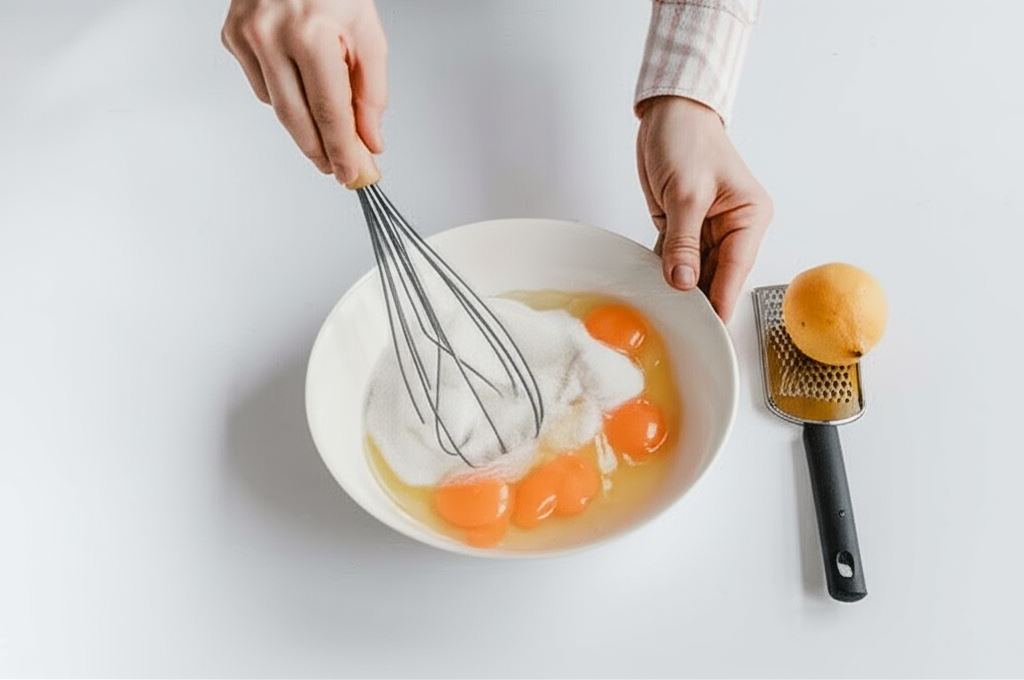Jajka z cukrem trzcinowym ubijamy na puszystą pianę. Dodajemy skórkę startą z cytryny.