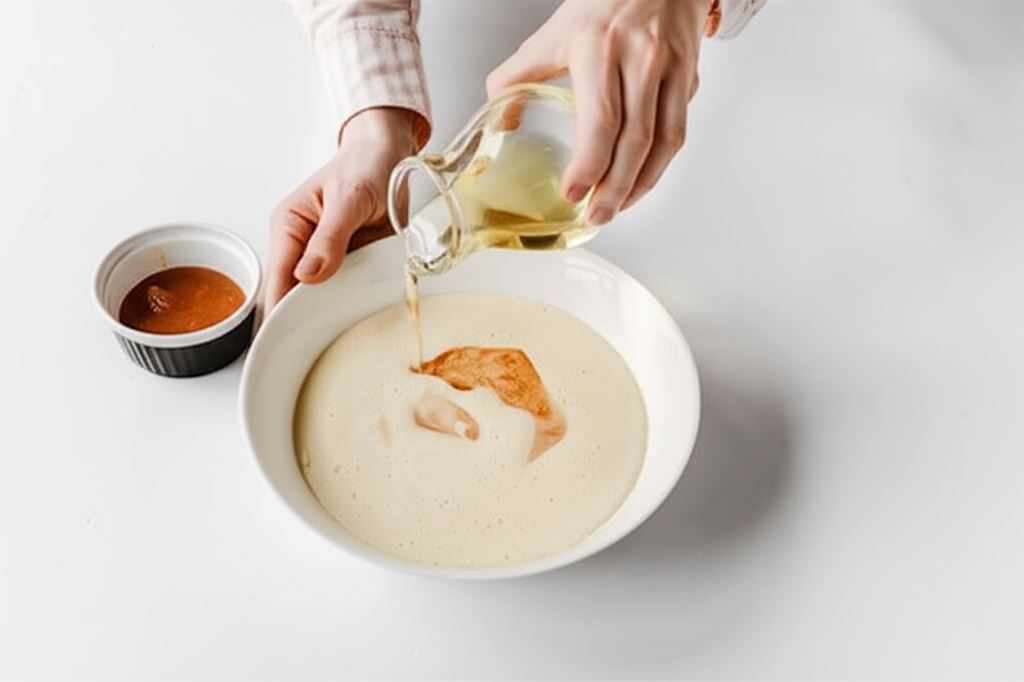 Stopniowo dolewamy olej nieustannie ubijając oraz łyżkę miodu.
