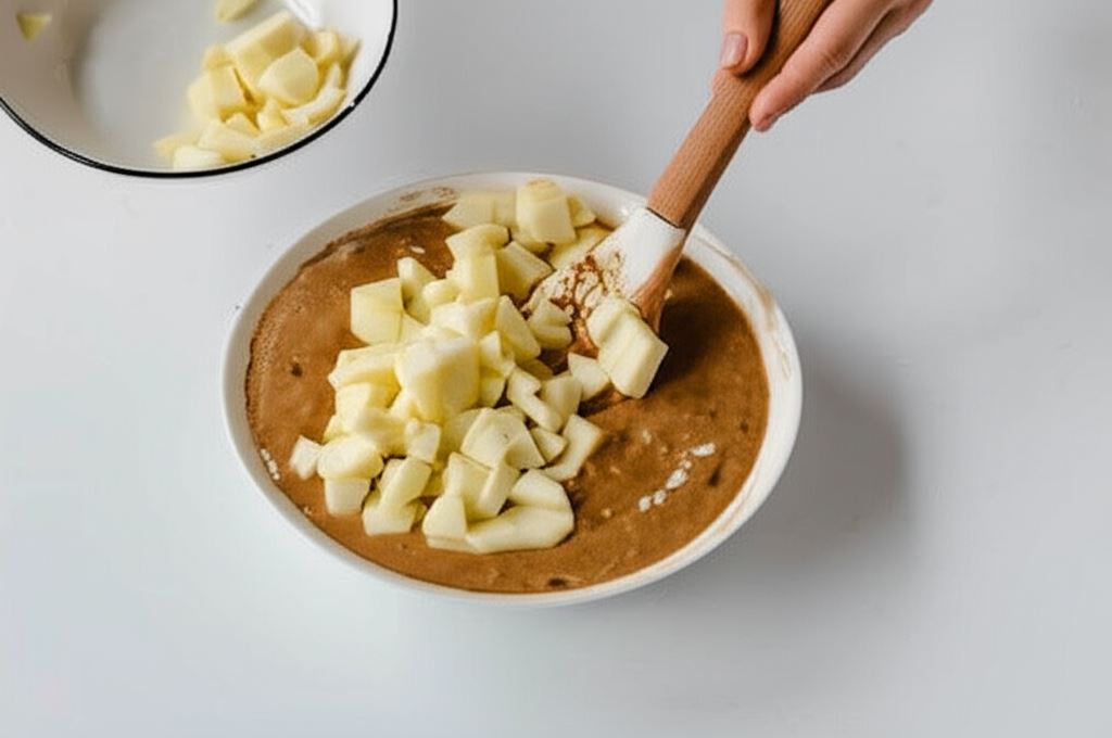 Na końcu wrzucamy jabłka pokrojone w kostkę. Wszystko starannie mieszamy.