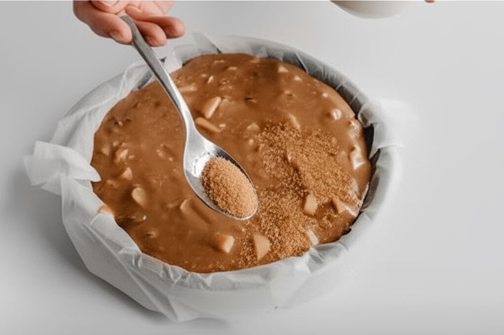 Ciasto wylewamy do formy wyścielonej papierem do pieczenia. Na wierzch sypiemy cukier trzcinowy. Umieszczamy w piekarniku rozgrzanym do 170 C i pieczemy około 50 min do suchego patyczka.
