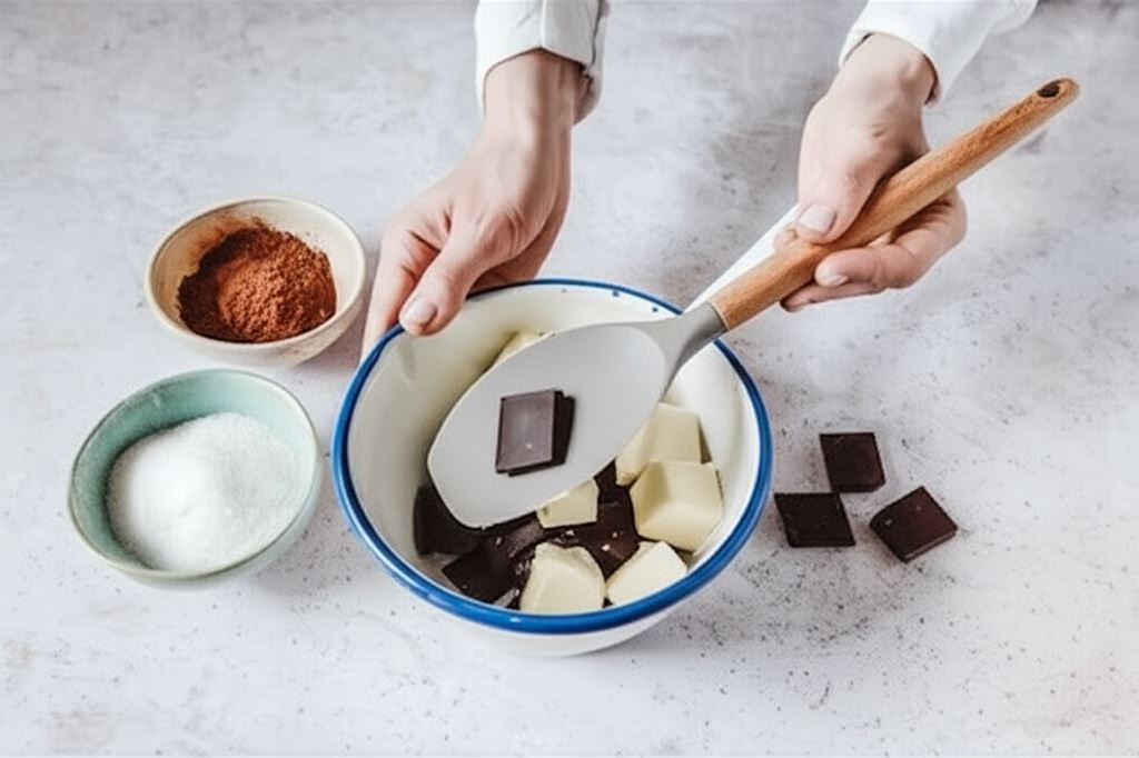 Naczynie smarujemy masłem i wykładamy papierem do pieczenia. Piekarnik ustawiamy na 180 °C. Czekoladę dzielimy na kosteczki i wkładamy do rondelka razem z pokrojonym masłem. Wszystko podgrzewamy ciągle mieszając, aż uzyskamy gęstą masę. Odstawiamy ją do ostygnięcia.