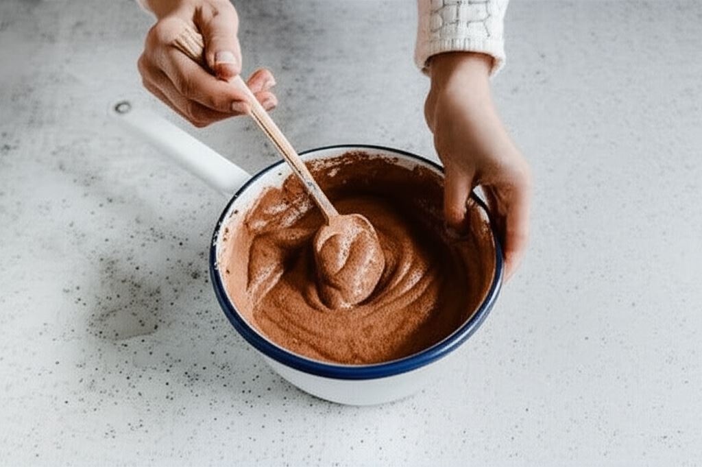 Żółtka łączymy z kakao. Potem dodajemy je do wystudzonej masy i mieszamy.