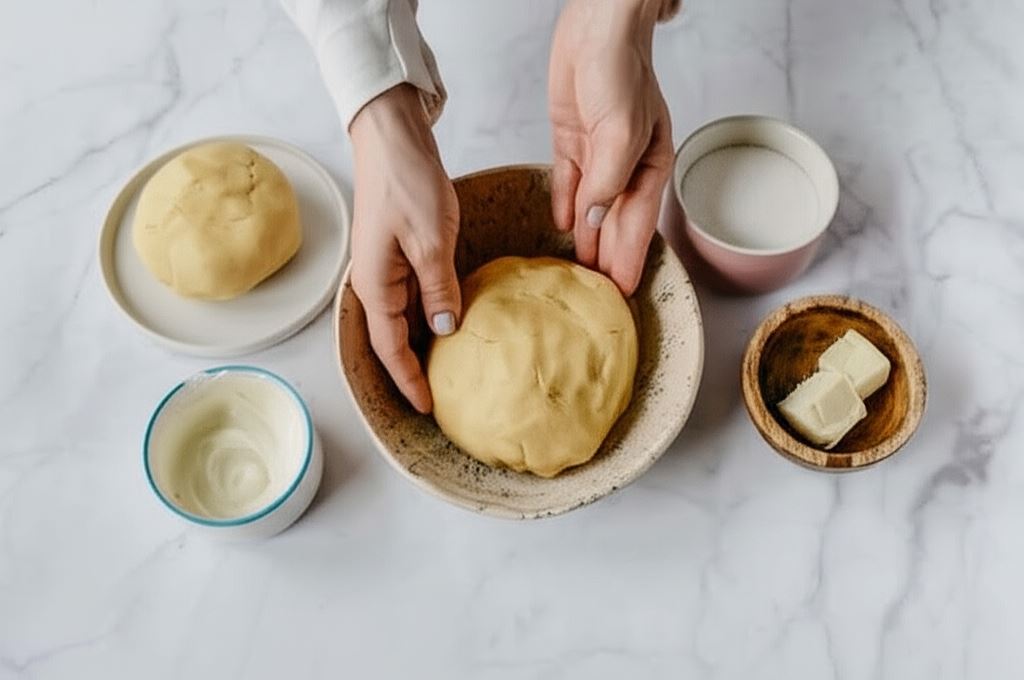Kształtujemy z tego dwie kule, jedna mniejsza druga większa. Mniejszą zawijamy w folię spożywczą i umieszczamy na 30 min w lodówce.