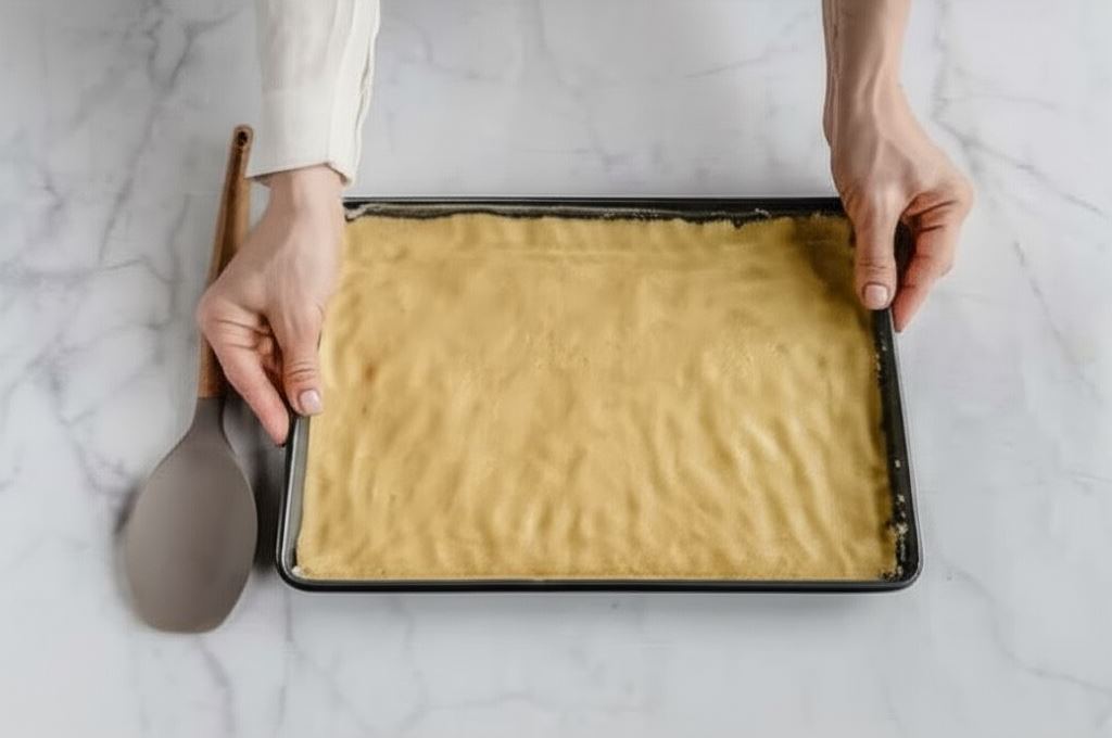 Na spód formy wyścielonej papierem do pieczenia nakładamy większą część ciasta i starannie ugniatamy. Formę z ciastem umieszczamy na 30 min w lodówce.