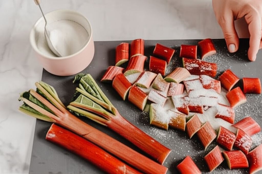 Rabarbar tniemy na kawałki o długości 2 cm i obtaczamy w jednej łyżce cukru.