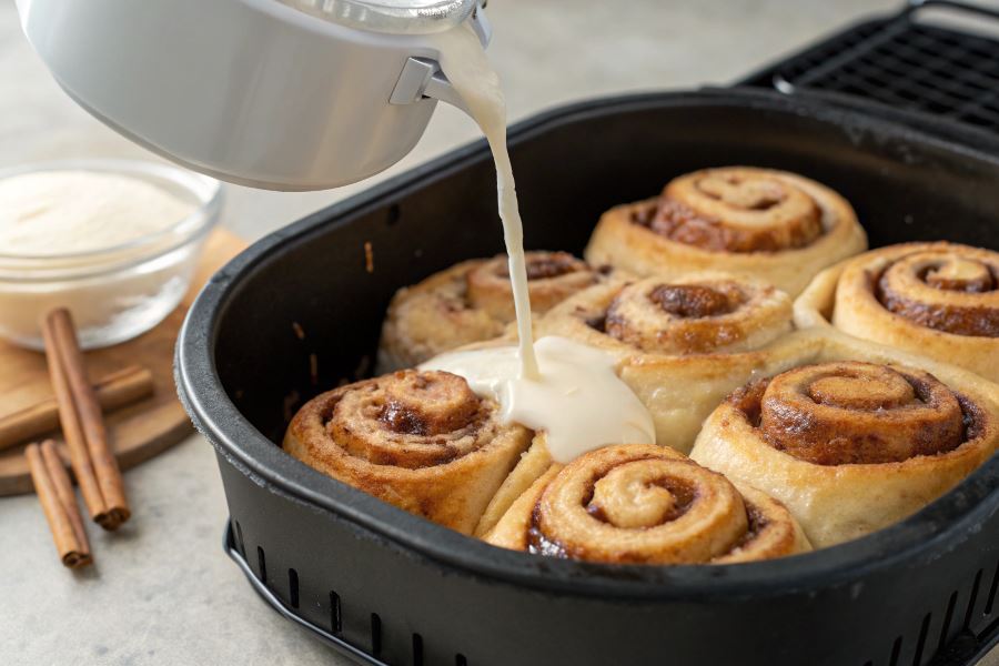 Glazurę najlepiej przygotować z 100 g cukru pudru wymieszanego z 2-3 łyżkami mleka lub śmietanki. Dla kremowej konsystencji można dodać 30 g serka śmietankowego. Polewanie należy wykonać gdy bułeczki są jeszcze ciepłe, ale nie gorące – około 5 minut po wyjęciu z airfryer.