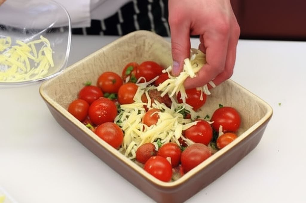 W naczyniu umieść pomidorki i posyp je ziołami oraz połową sera.