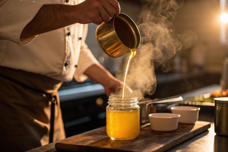 Masło klarowane to produkt otrzymywany poprzez oddzielenie tłuszczu mlecznego od białek mleka, wody i laktozy. Proces ten polega na powolnym podgrzewaniu masła, co powoduje odparowanie wody i opadanie białek na dno naczynia. W rezultacie powstaje czysty tłuszcz mleczny o złocistym kolorze i intensywnym, orzechowym aromacie. W Polsce masło klarowane jest cenione zarówno w tradycyjnej kuchni, jak i nowoczesnych przepisach kulinarnych.