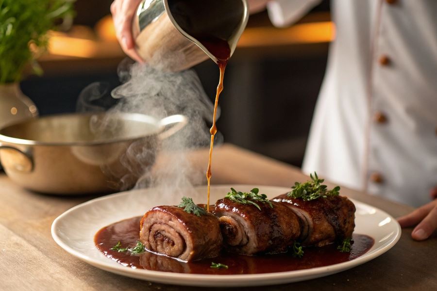Tradycyjny sos pieczeniowy stanowi kwintesencję smaku towarzyszącego roladkom wołowym. Podstawą dobrego sosu jest odpowiednio przygotowany wywar z kości wołowych, warzyw korzeniowych i aromatycznych ziół. Czerwone wino, najlepiej wytrawne typu Merlot lub Cabernet Sauvignon, dodaje sosowi głębi i szlachetnego aromatu.