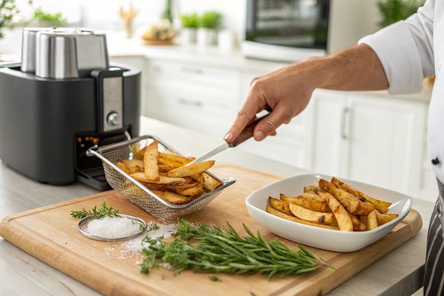 Po wyjęciu z tłuszczu frytki osączamy na papierowym ręczniku i natychmiast przyprawiamy solą, która przylgnie do gorącej powierzchni. Dla wyrafinowanego smaku warto eksperymentować z przyprawami jak papryka wędzona, czosnek granulowany czy suszone zioła prowansalskie.