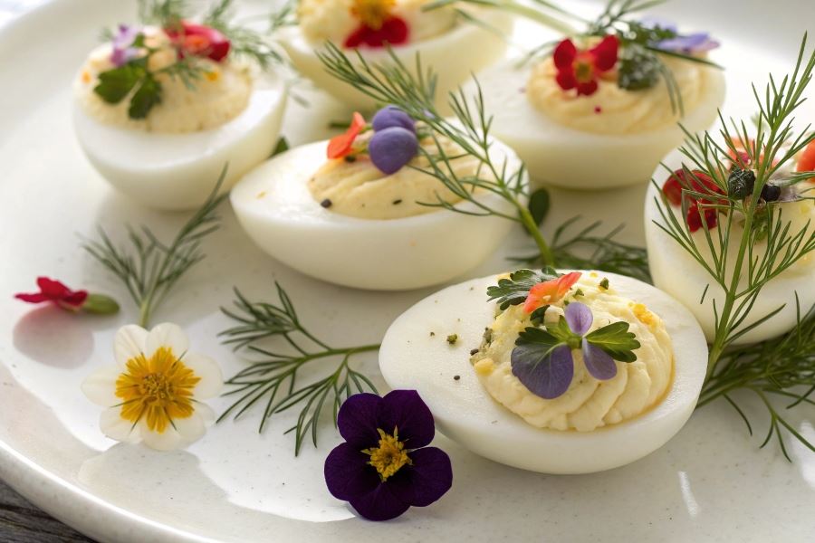 Współczesne trendy dekoracyjne wykraczają poza tradycyjne posypanie jajek szczypiorkiem. Jadalne kwiaty takie jak nasturcje, fiołki czy płatki róż dodają elegancji i nieoczekiwanego koloru. Szefowie kuchni eksperymentują z proszkami spożywczymi – sproszkowany burak, szpinak czy kurkuma tworzą kolorowe akcenty na białku jajka.