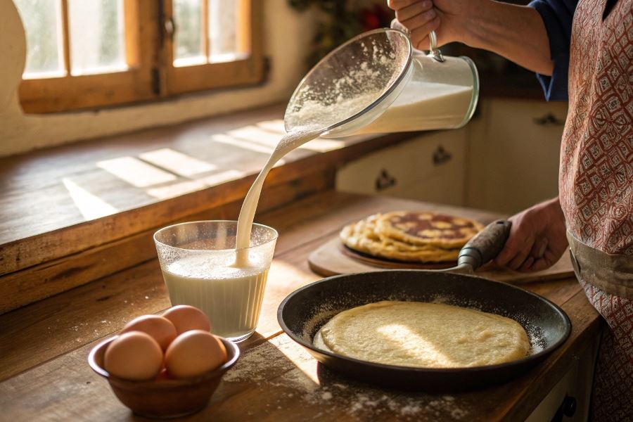 Ta proporcja 1:1 mleka do mąki zapewnia idealne ciasto – ani zbyt gęste, ani zbyt rzadkie. Jajka nadają elastyczność, a olej zapobiega przywieraniu do patelni.
