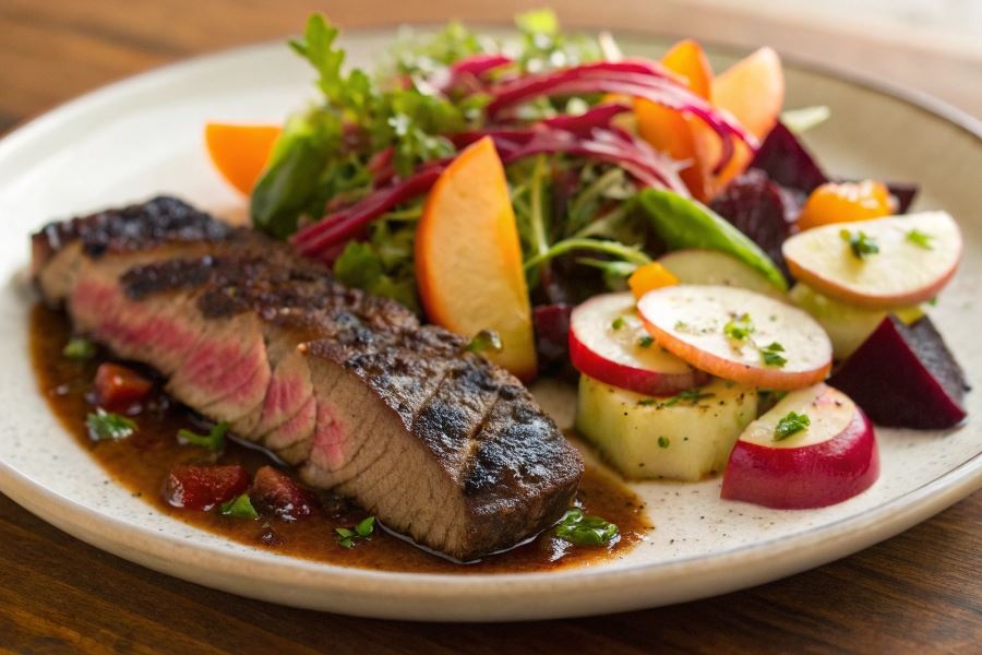 Sałatka z grillowanych warzyw wprowadza nowy wymiar do tradycyjnego podania wątróbki. Lekko karmelizowana papryka, cukinia i bakłażan tworzą ciepłą bazę, która podkreśla delikatność wątróbki. Skropienie oliwą truflową dodatkowo wzbogaca całe danie. Ta propozycja szczególnie dobrze sprawdza się w chłodniejsze dni, gdy klasyczna zimna surówka może nie być pierwszym wyborem.