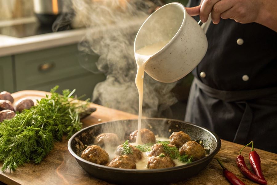 Biały sos grzybowy wprowadza klopsiki na wyższy poziom kulinarny. Podsmażone pieczarki lub suszone borowiki namoczone w ciepłej wodzie tworzą intensywną bazę smakową. Połączenie grzybów z delikatną śmietaną tworzy harmonijną kompozycję umami, idealnie dopełniającą mięsne klopsiki.