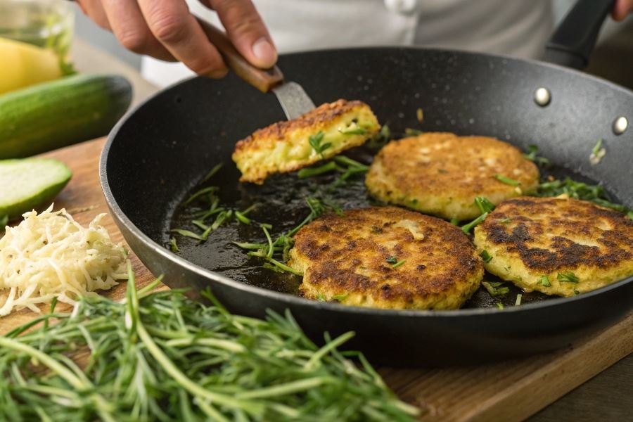Placki smażone na rozgrzanym oleju przez 2-3 minuty z każdej strony zyskują złocistą, chrupiącą skórkę. Doskonale komponują się z klasyką polskiej kuchni – śmietaną wymieszaną ze świeżym koperkiem lub sosem czosnkowym.