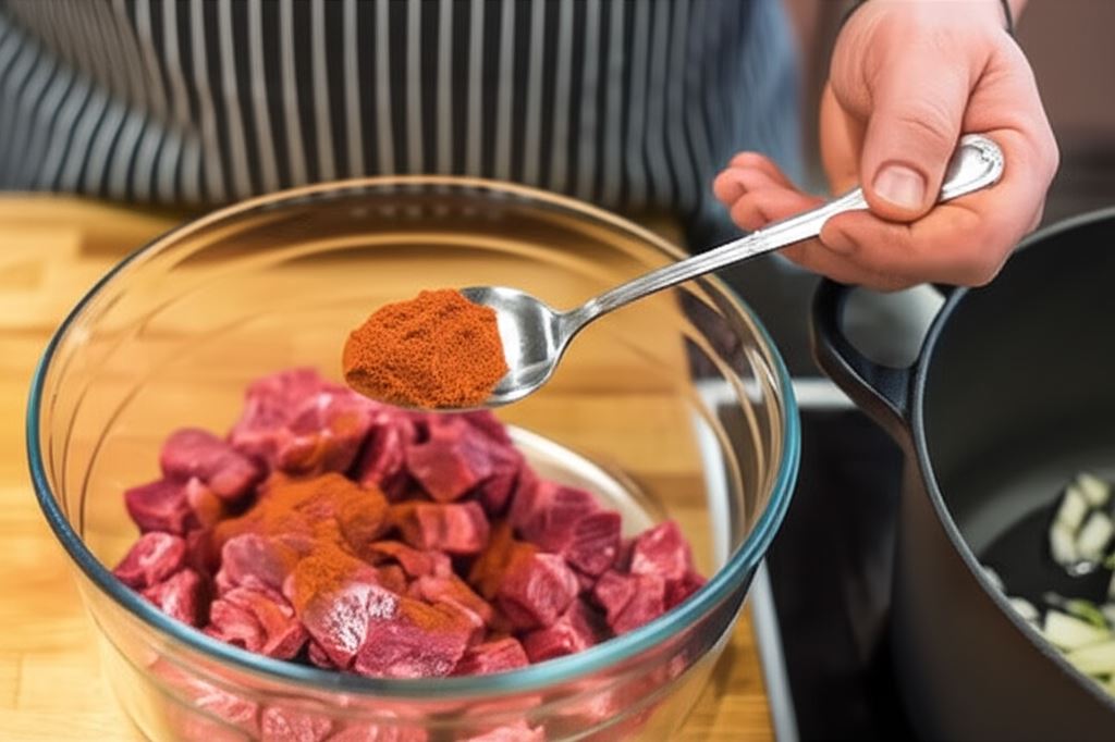 Cebule posiekaj w kostkę i zezłoć w garnku na rozgrzanym tłuszczu. Mięso pokrój w kawałki 3x3 cm, posyp słodką papryką, pieprzem i dodaj do garnka z cebulą. Smaż przez kilka minut, mieszając regularnie.