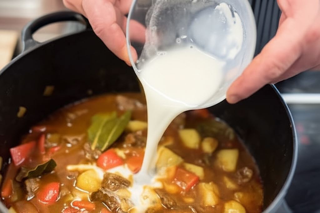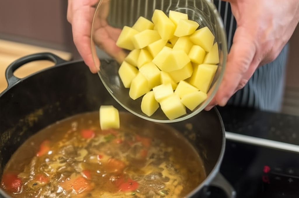 Mąkę wymieszaj w niewielkiej ilości wody, dodaj do gulaszu i doprowadź do wrzenia. Gotuj jeszcze moment, aż mięso i ziemniaki staną się miękkie. Serwuj natychmiast, najlepiej z chlebem.