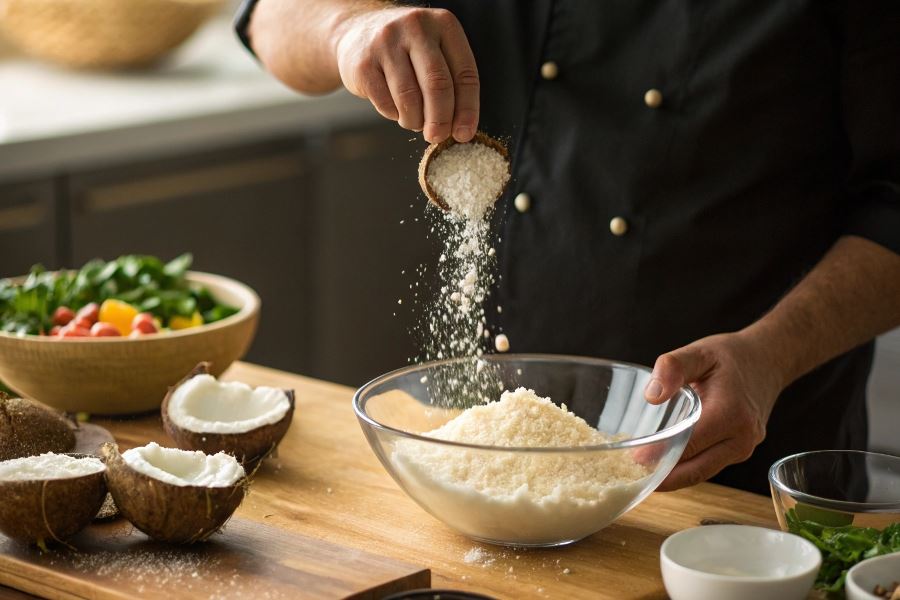 Mąka kokosowa ma charakterystyczną, lekko słodkawą nutę, która wzbogaca smak wypieków bez konieczności dodawania cukru. Jej struktura jest bardziej chłonna niż mąki pszennej, co wymaga modyfikacji proporcji płynów w przepisach.