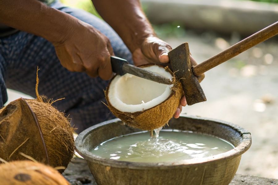 Otwieranie kokosa może wydawać się wyzwaniem, jednak z odpowiednim podejściem staje się proste. Klasyczna metoda wykorzystuje młotek i śrubokręt – należy zlokalizować trzy naturalne „oczka” na jednym z końców kokosa, a następnie wbić śrubokręt w jedno z nich i delikatnie uderzać młotkiem, aż do przebicia skorupy. Po odwróceniu kokosa woda wypłynie naturalnie. Następnie wystarczy mocniejsze uderzenie młotkiem wzdłuż naturalnej linii biegnącej przez środek owocu, aby rozłupać go na dwie części.