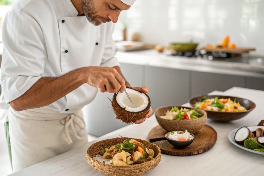 Miąższ kokosa nadaje wytrawnym potrawom kremową konsystencję i subtelną słodycz. Curry z mleczkiem kokosowym zyskuje nowy wymiar, gdy dodamy do niego kawałki świeżego miąższu. Sałatki z dodatkiem kokosa, szczególnie te z mango, awokado i krewetkami, zachwycają kontrastem smaków i tekstur.