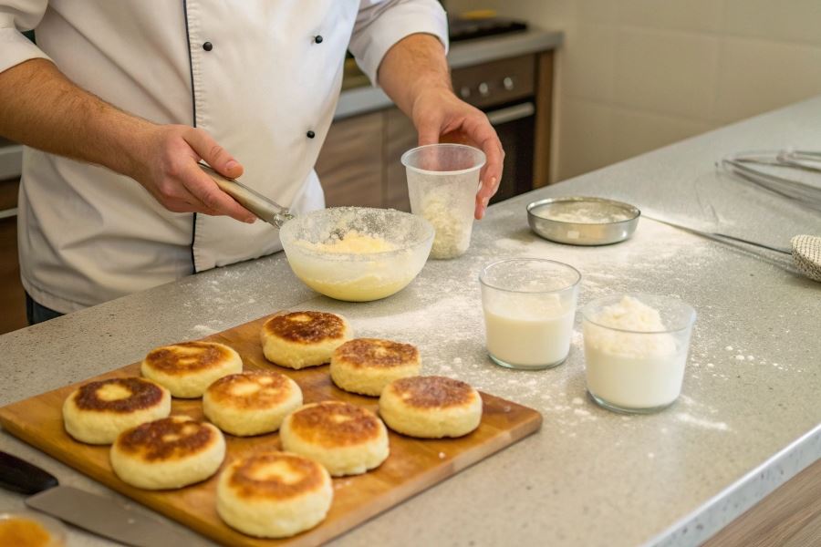 Nieprawidłowe obtaczanie w mące może prowadzić do przypalania się zewnętrznej warstwy. Nadmiar mąki należy delikatnie strzepnąć przed smażeniem. Syrniki najlepiej smażyć na średnim ogniu, po 3-4 minuty z każdej strony, aż uzyskają złocisty kolor.