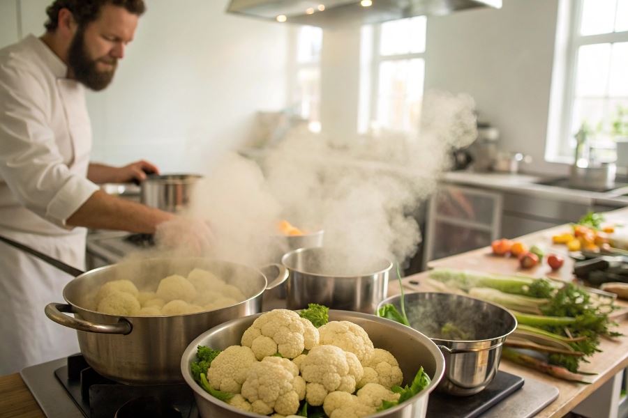 Gotowanie na parze (8-12 minut) to metoda pozwalająca zachować najwięcej składników odżywczych. Kalafior zachowuje jędrność i nie nasiąka wodą, co czyni go idealnym do sałatek i przystawek. Różyczki umieszcza się w specjalnym naczyniu nad gotującą się wodą, bez bezpośredniego kontaktu z nią.
