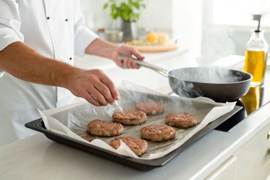 Technika smażenia dietetycznego: rozgrzej patelnię z arkuszem pergaminu bez dodatku tłuszczu, ułóż uformowane kotlety i smaż pod przykryciem przez około 5 minut z każdej strony. Dzięki temu kotlety będą soczyste wewnątrz, a jednocześnie zyskają apetyczną skórkę.