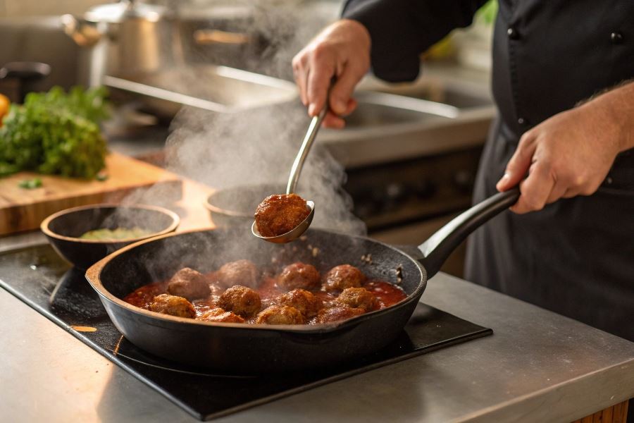 - Delikatnie potrząsać patelnią zamiast mieszać łyżką, co chroni pulpety przed rozpadaniem