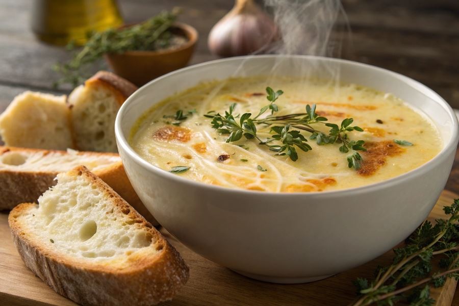 5. Mieszaj zupę ruchem kolistym, unikając gwałtownego gotowania – temperatura nie powinna przekraczać 85°C, aby ser nie zważył się.