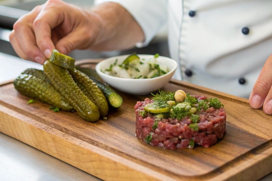 Innowacyjnym rozwiązaniem jest też marynowanie ogórków kiszonych w ziołach (koperek, estragon) przez 2 godziny przed dodaniem do tatara, co wzbogaca profil smakowy całej potrawy.