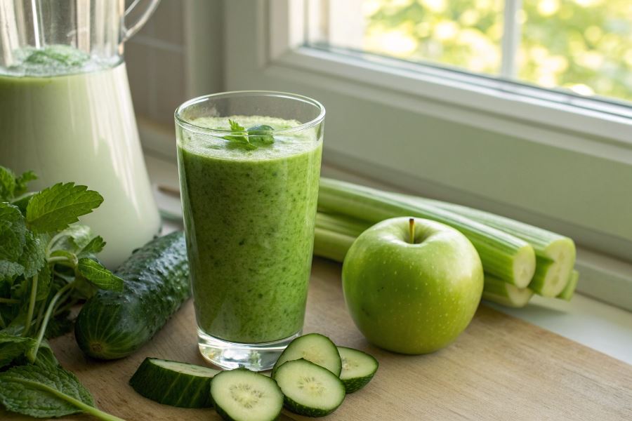 Detoksykujące smoothie z ogórkiem i selerem łączy właściwości oczyszczające obu warzyw. Łodyga selera naciowego, ogórek, garść szpinaku, kawałek imbiru i sok z cytryny tworzą napój o silnych właściwościach detoksykujących. Blendery o mocy powyżej 800W poradzą sobie z włóknistym selerem bez problemu, tworząc aksamitną konsystencję.