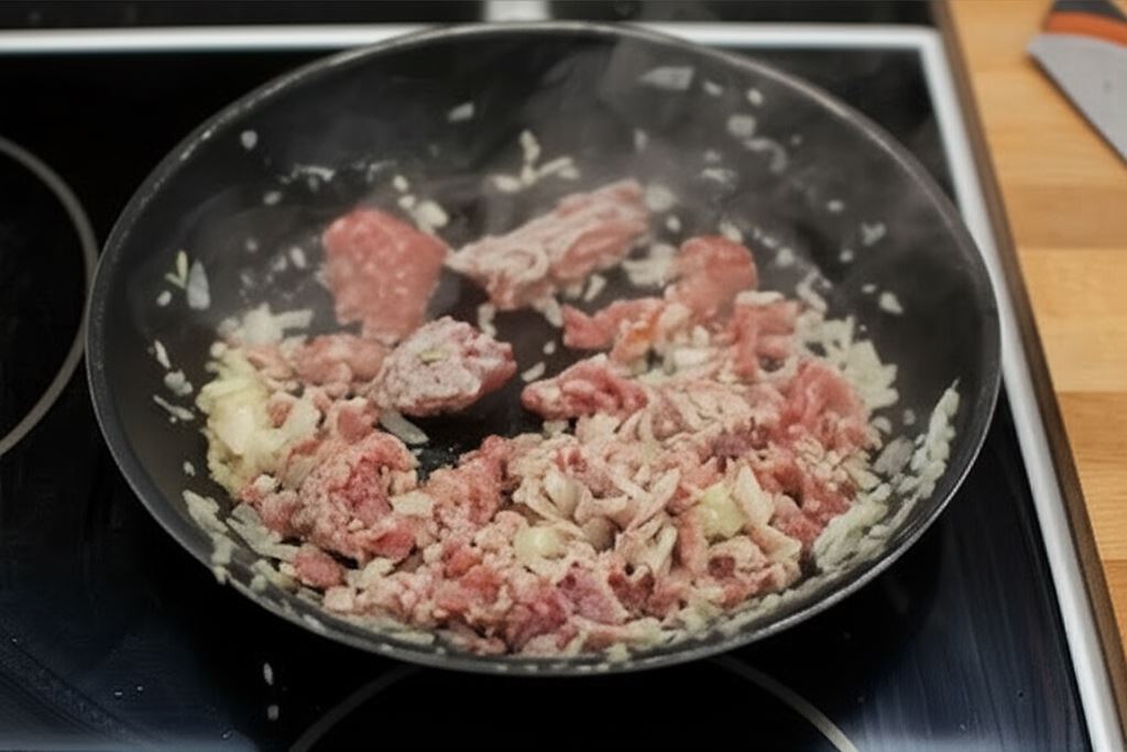 Mięso mielone do wypełnienia cukinii razem z posiekaną na drobne kawałki cebulą smaż przez około 8 minut, do momentu zrumienienia.