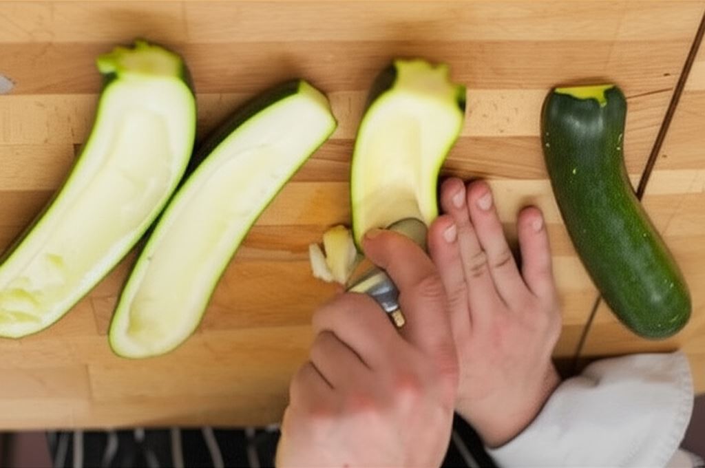W międzyczasie dokładnie umyj cukinię, odetnij końce i przekrój ją wzdłuż na połowę. Potem wydrąż pestki, korzystając np. z łyżeczki.
