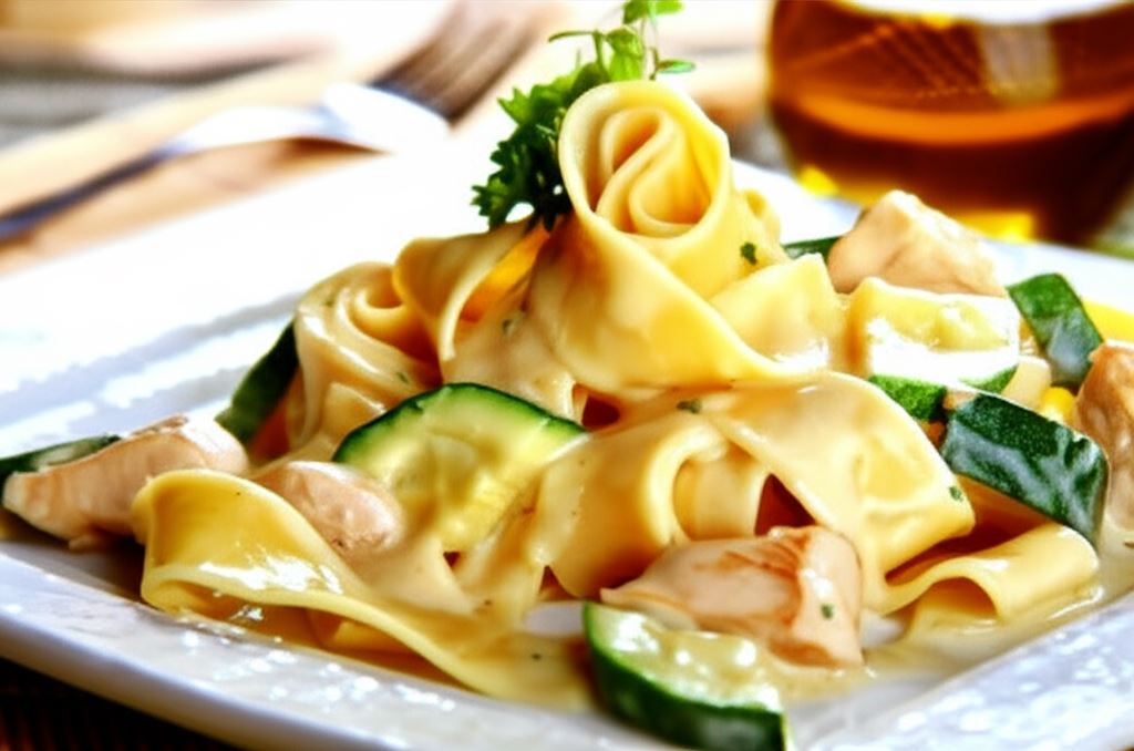 Odkryj harmonię smaków w tym prostym, a jednocześnie wyrafinowanym daniu! Soczyste kawałki kurczaka spotykają się z delikatną cukinią, tworząc duet idealny dla każdego podniebienia. Całość otulona kremowym sosem serowym tworzy kompozycję, która zachwyci nawet najbardziej wymagających smakoszy.