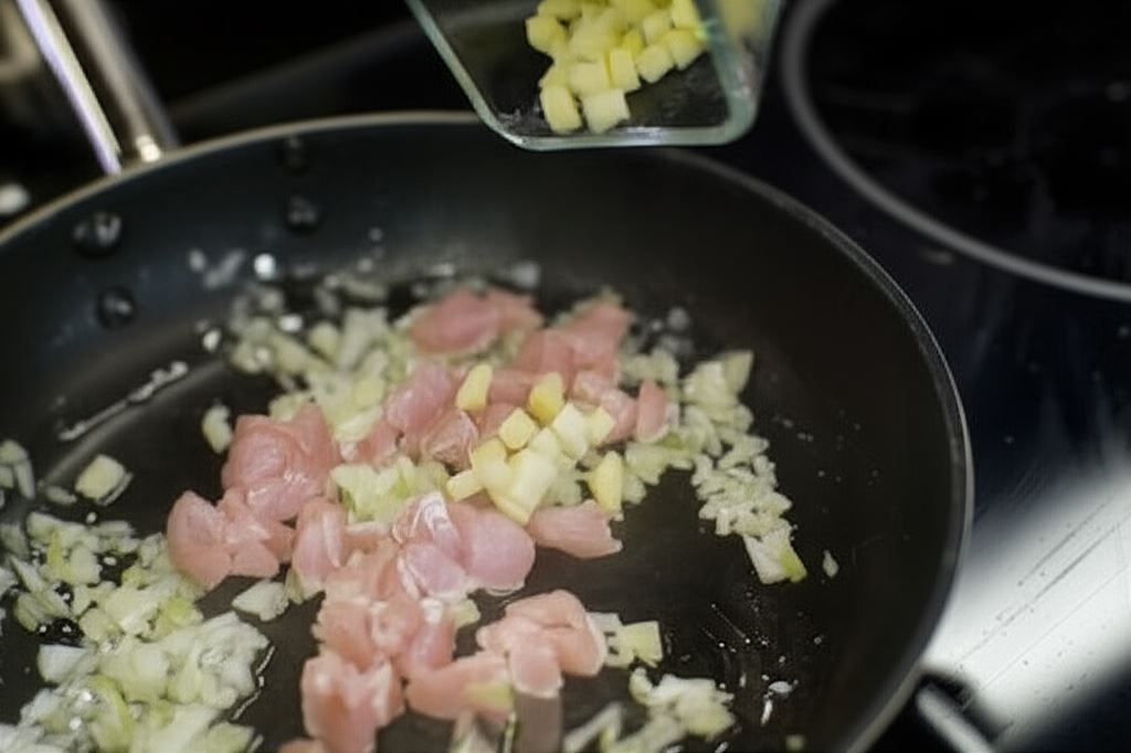 Do cebuli wsyp pokrojonego w kostkę indyka i miąższ z cukinii. Przesmaż stale mieszając.