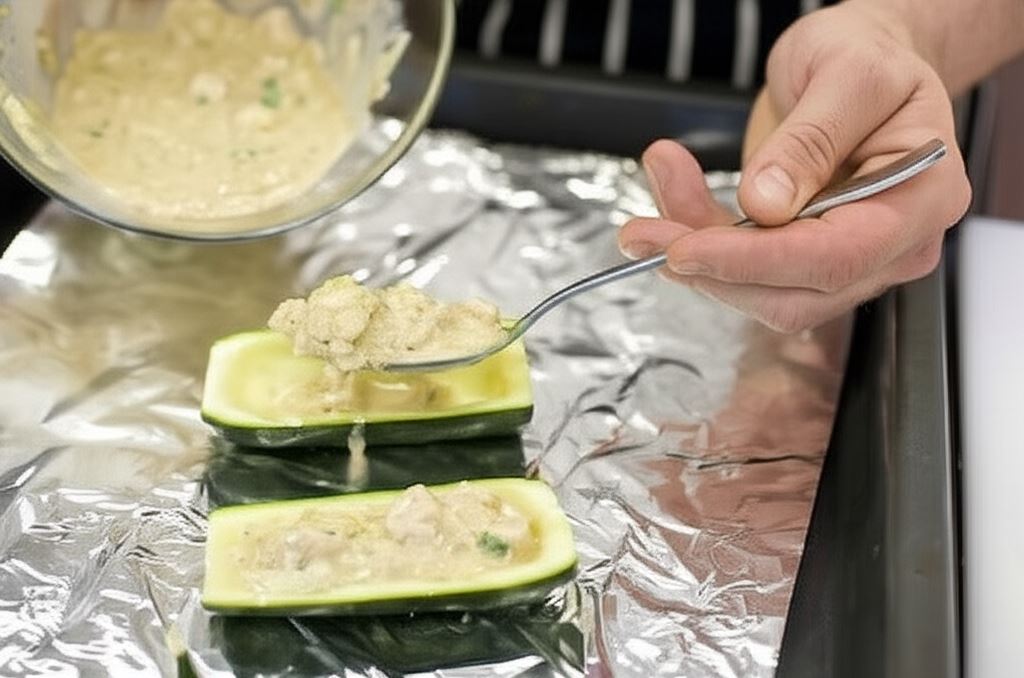 Cukinie opłucz, usuń końcówki, przekrój wzdłużnie na połowy i usuń część miąższu. Wnętrze posmaruj olejem. Drobno posiekaną cebulę zeszklij na oleju.