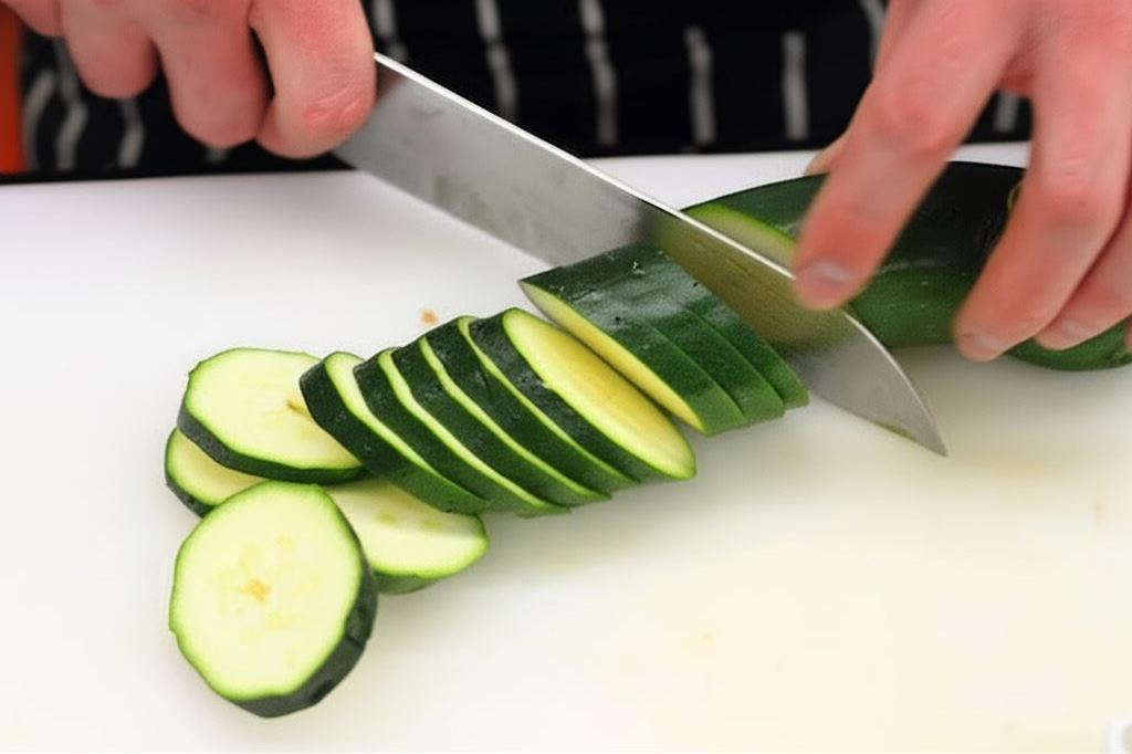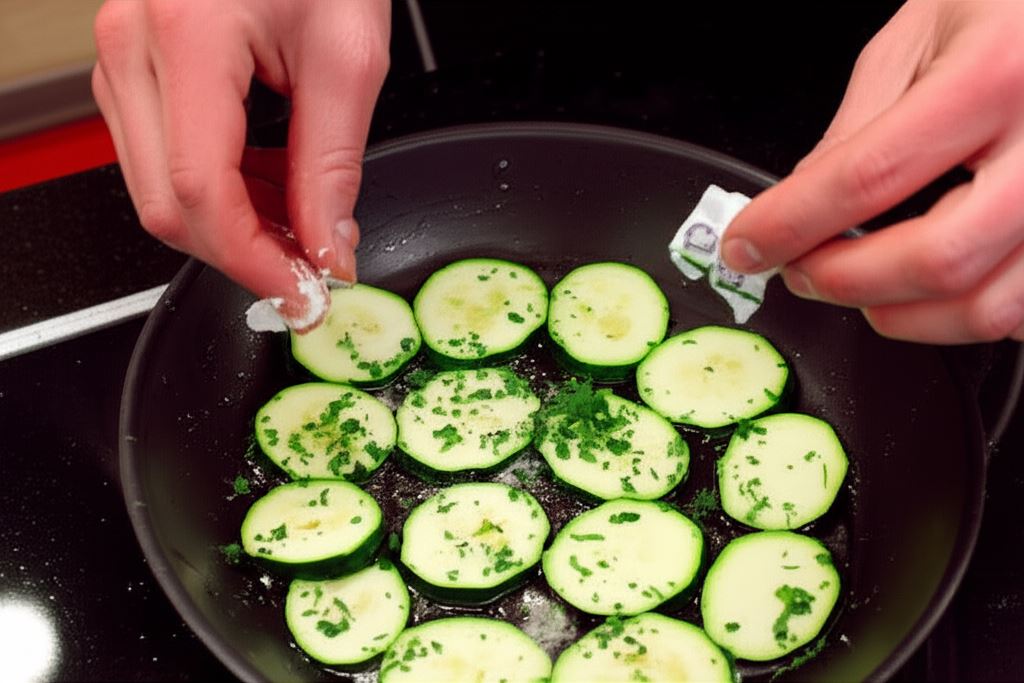 Na rozgrzanej oliwie podsmaż cukinię, posyp ziołami i rozdrobnionymi Mini kostkami Czosnek Knorr.