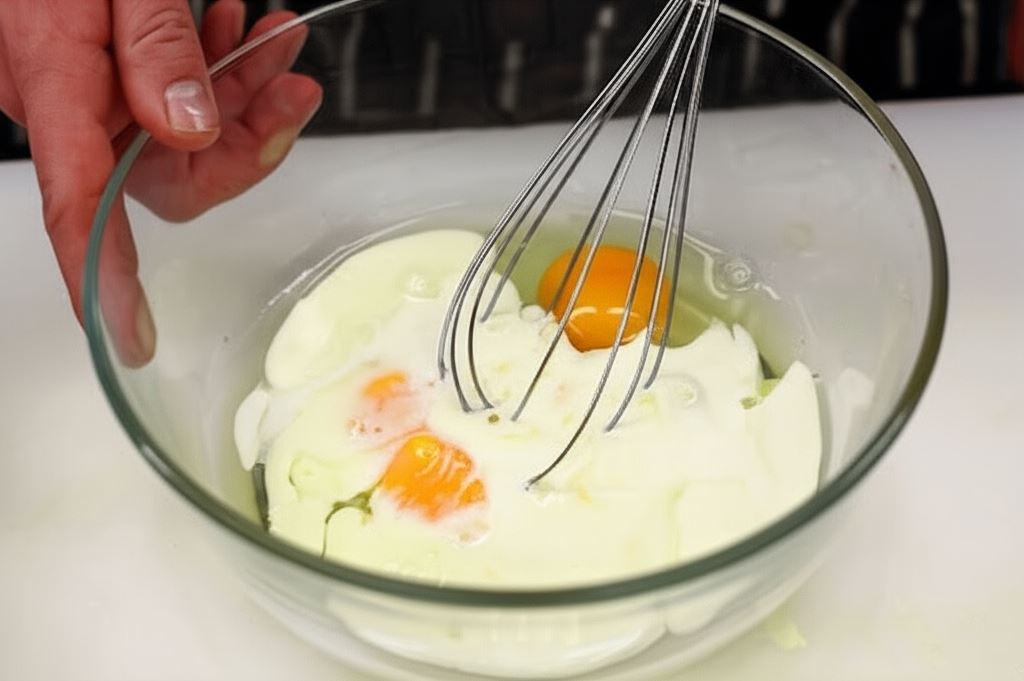 Ubij starannie jajka, wsyp mleko, śmietankę, przypraw do smaku gałką muszkatołową i pieprzem.