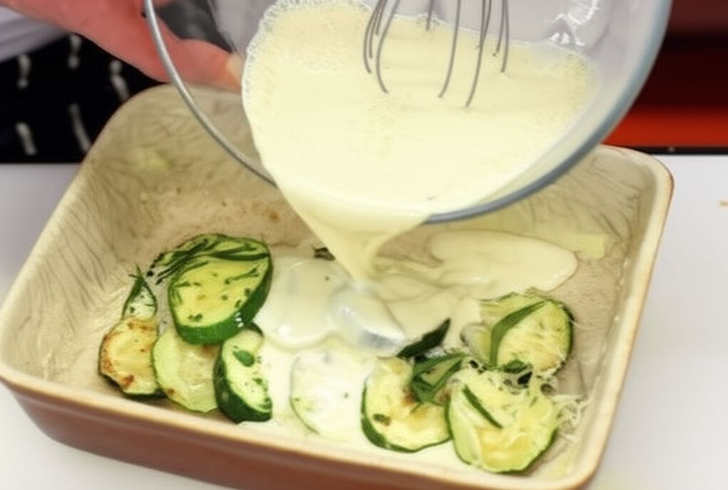 Polej cukinię sosem jajecznym i posyp pozostałym serem. Piecz przez 25-30 minut w piekarniku nagrzanym do 180°C.