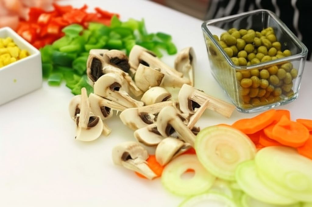 Pokrój na plastry cebulę, pieczarki i marchew. Posiekaj w kostkę papryki i kapustę. Odcedź warzywa z puszki. Kurczaka podziel na plasterki.