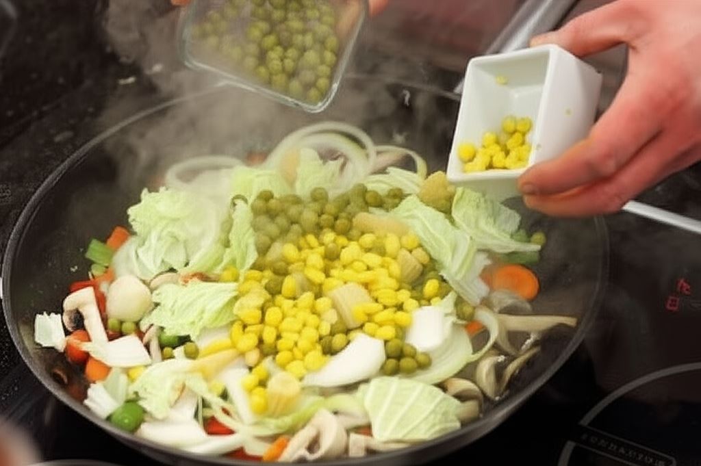 Wszystkie warzywa oraz odcedzone kiełki, groszek, kukurydzę i bambus, wrzuć na ten tłuszcz i podsmażaj.