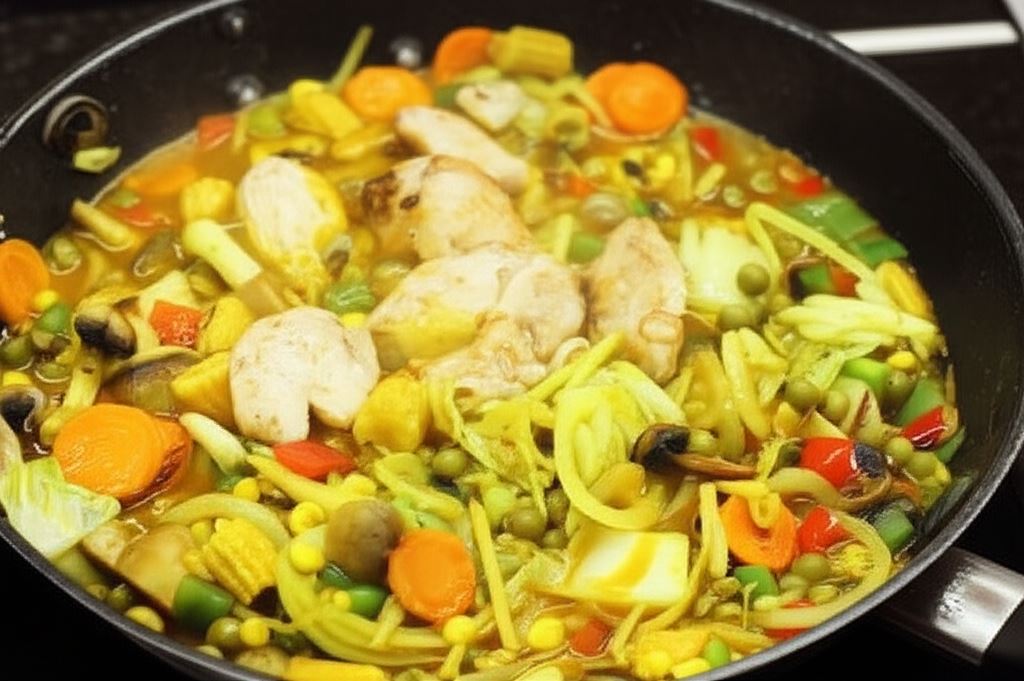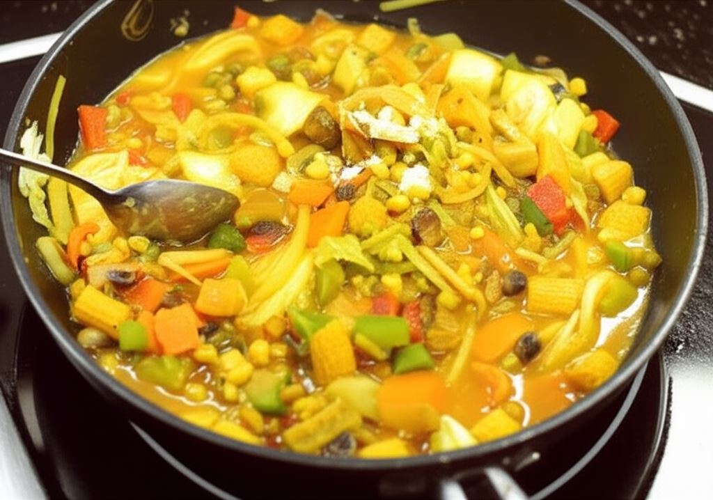 Wlej pół szklanki wody, kostkę Knorr oraz curry i chili. Gotuj na małym ogniu, aż warzywa będą miękkie.